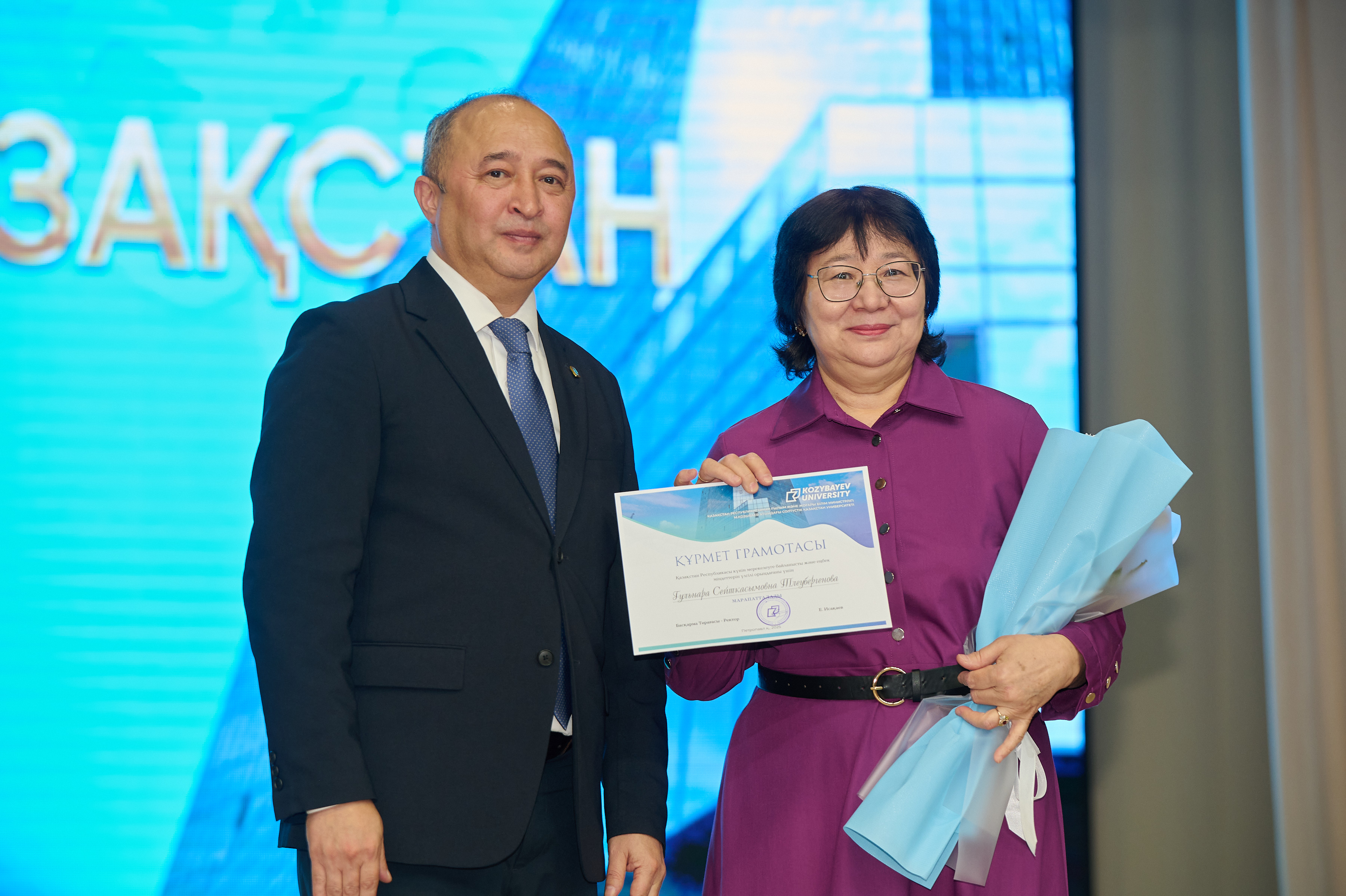 Халқымыздың рухын көтеріп, бірлігімізді нығайтатын айшықты мереке қарсаңында, еліміздегі ғылым, жоғары білім саласында кәсіби біліктілік танытқан оқытушыларды, оқу ордамыздың дамуына елеулі үлес қосып жүрген қызметкерлерді марапаттау рәсімі өтті. ҚР «Құрмет» орденімен «Қазақ тілі мен әдебиеті» кафедрасының профессоры Жанар Таласпаева марапатталды.