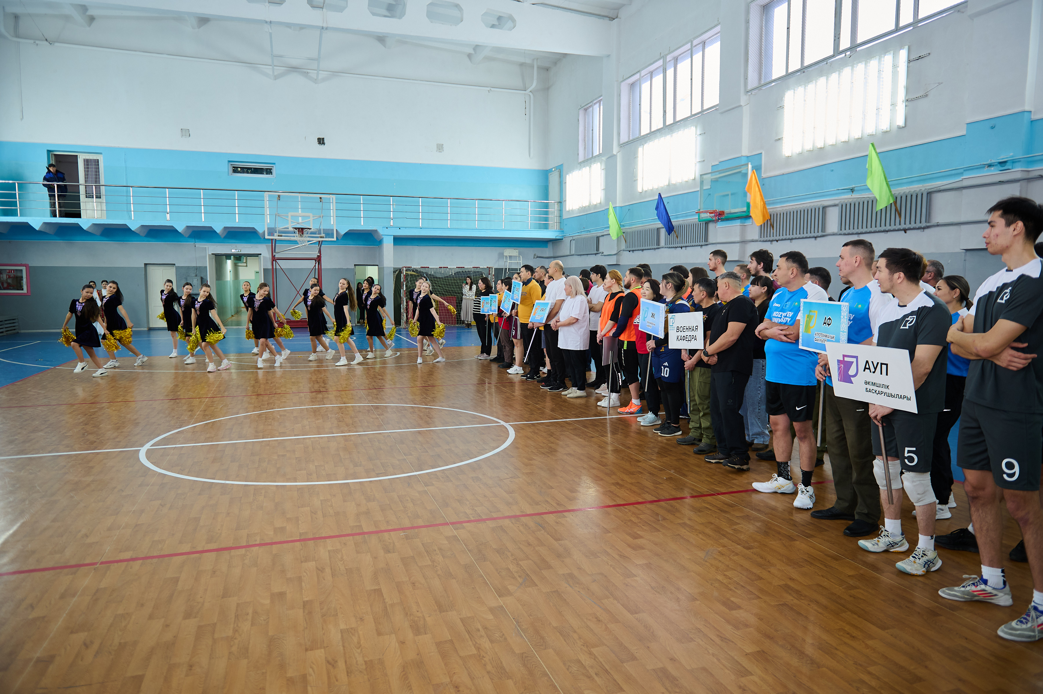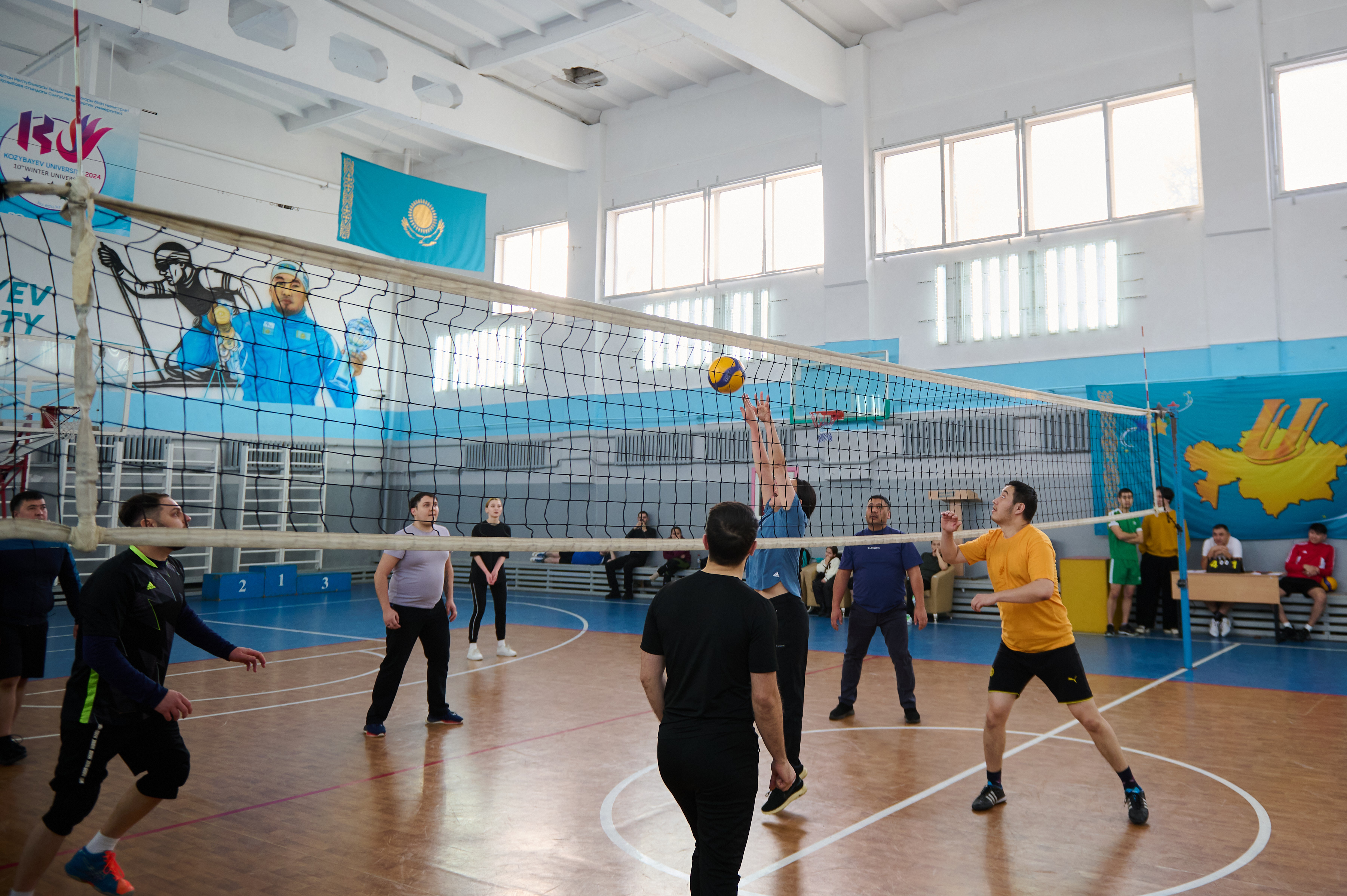 Сайыстың алғашқы күні тартысты өтіп, волейбол ойындарымен жалғасын тапты. Барлығы 9 команда қатысып, әр топтың жеңімпаздары жартылай финалға өтті. Ақтық кезеңде ПФ спортшылары ойынды жеңіспен аяқтады. Қарсыластарының мықтылығына қарамастан ӘК ойыншылары тамаша өнер көрсетіп 2 орынға табан тіреді. Ал 3 орынға АФ жайғасты.