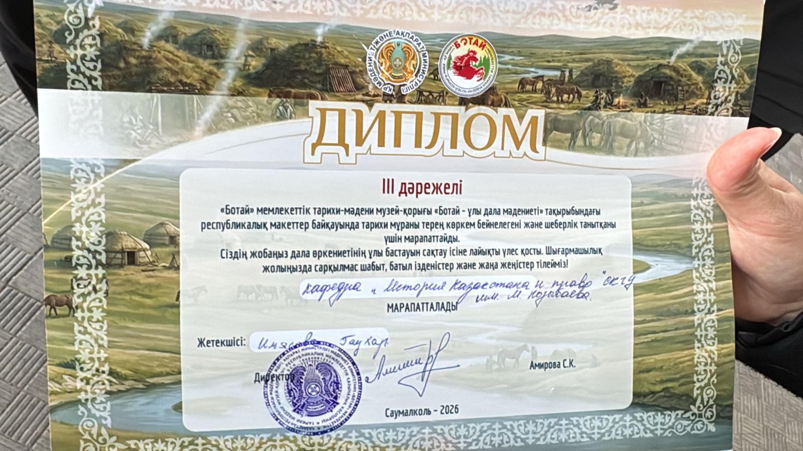 Ио-25к(ІР) тобының «Тарих, экономика және құқық» факультетінің студенттері біздің университетті «Ботай – Ұлы дала мәдениеті» республикалық макеттер байқауында лайықты түрде таныстырып, тарихи мұраны зерттеуге дайындықтың жоғары деңгейін және шығармашылықпен қарауды көрсетті.