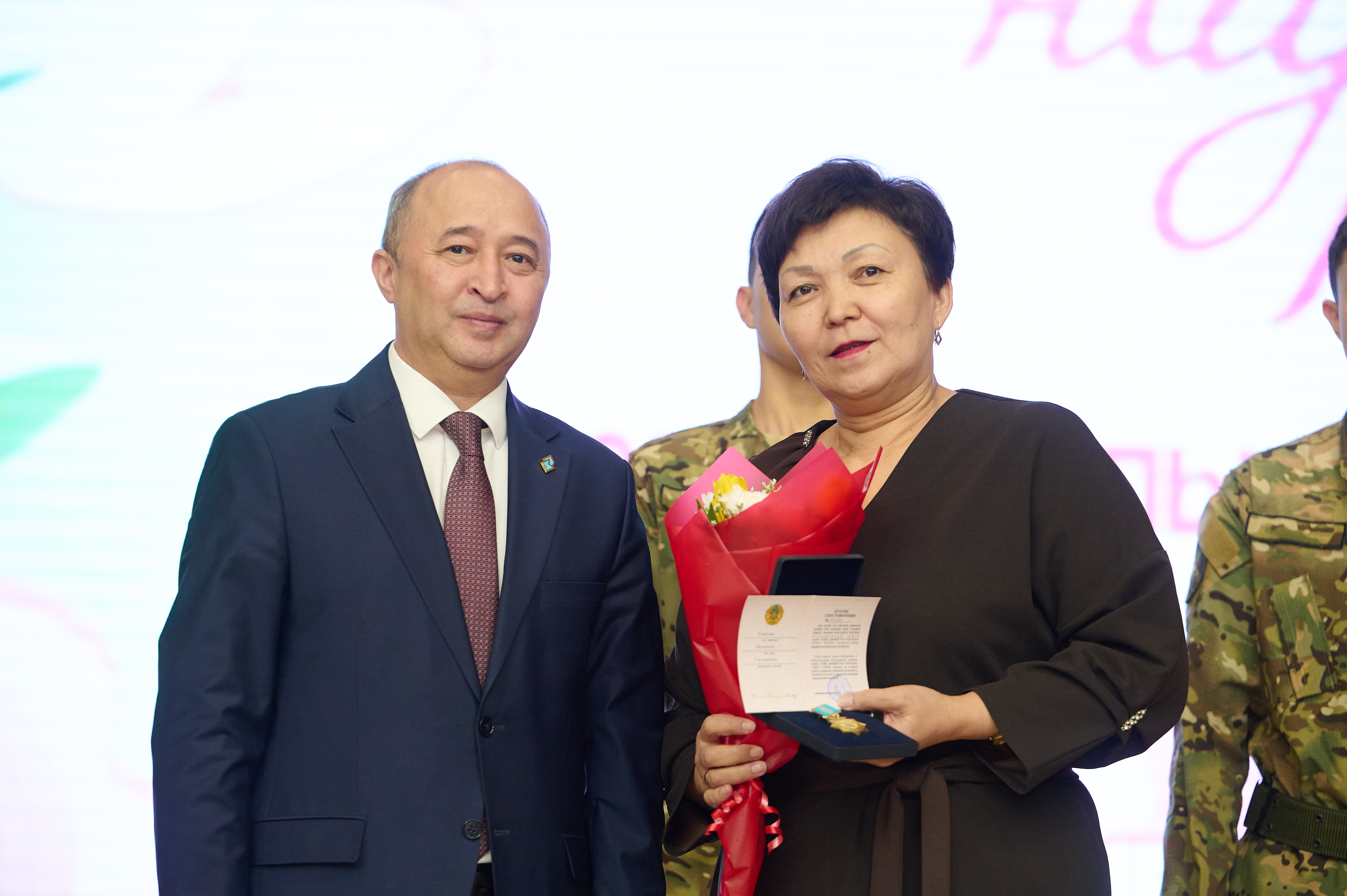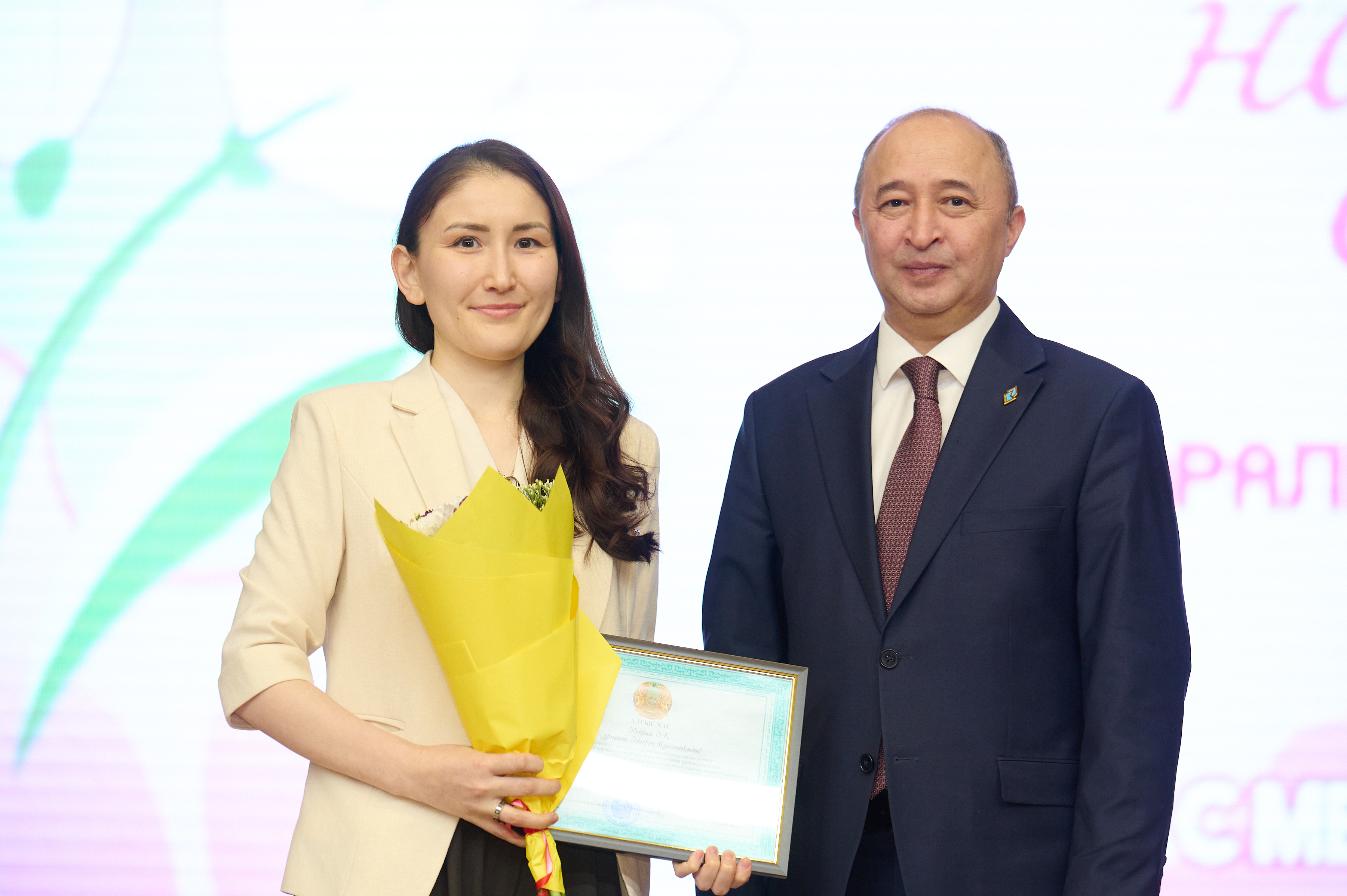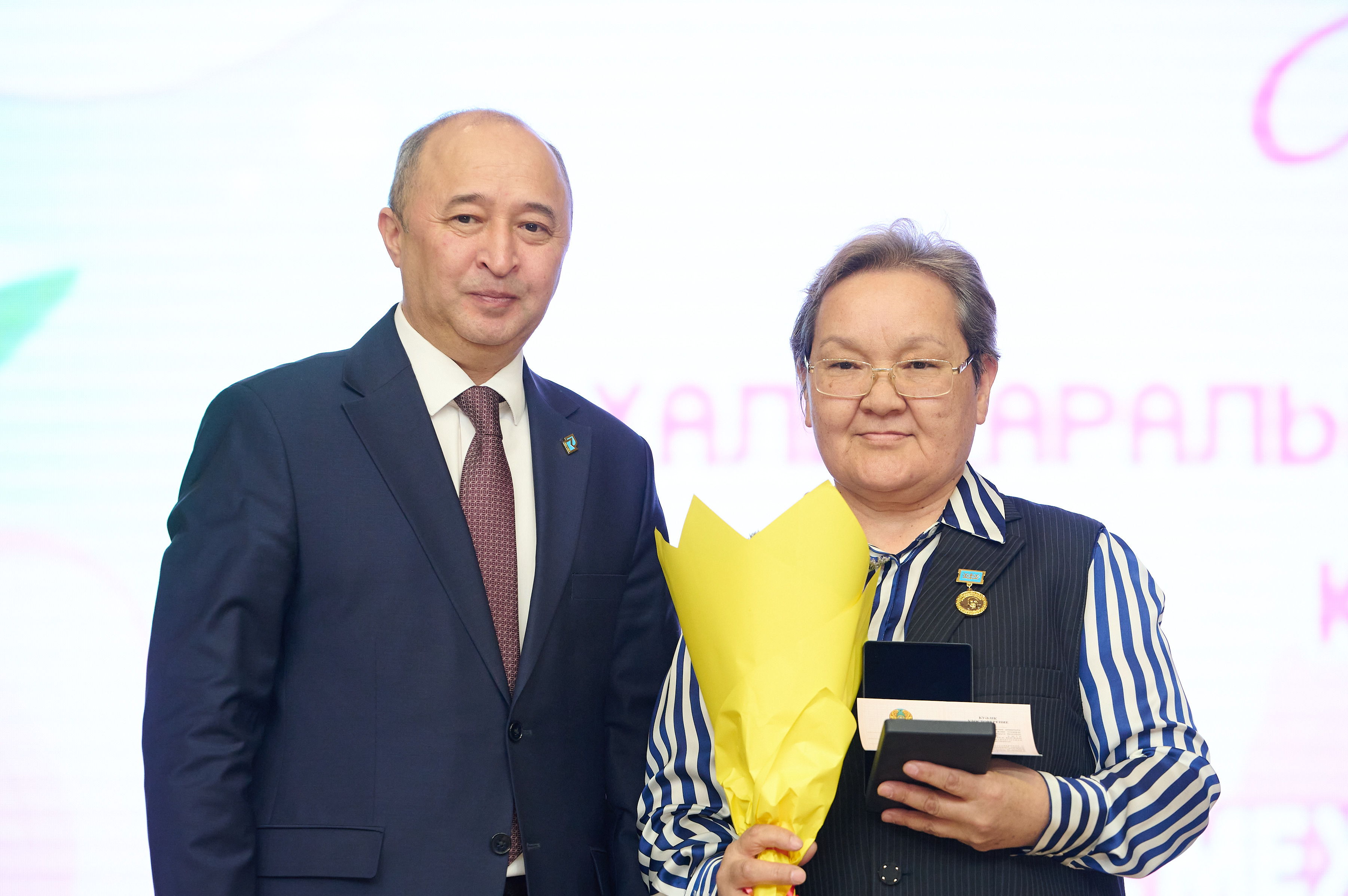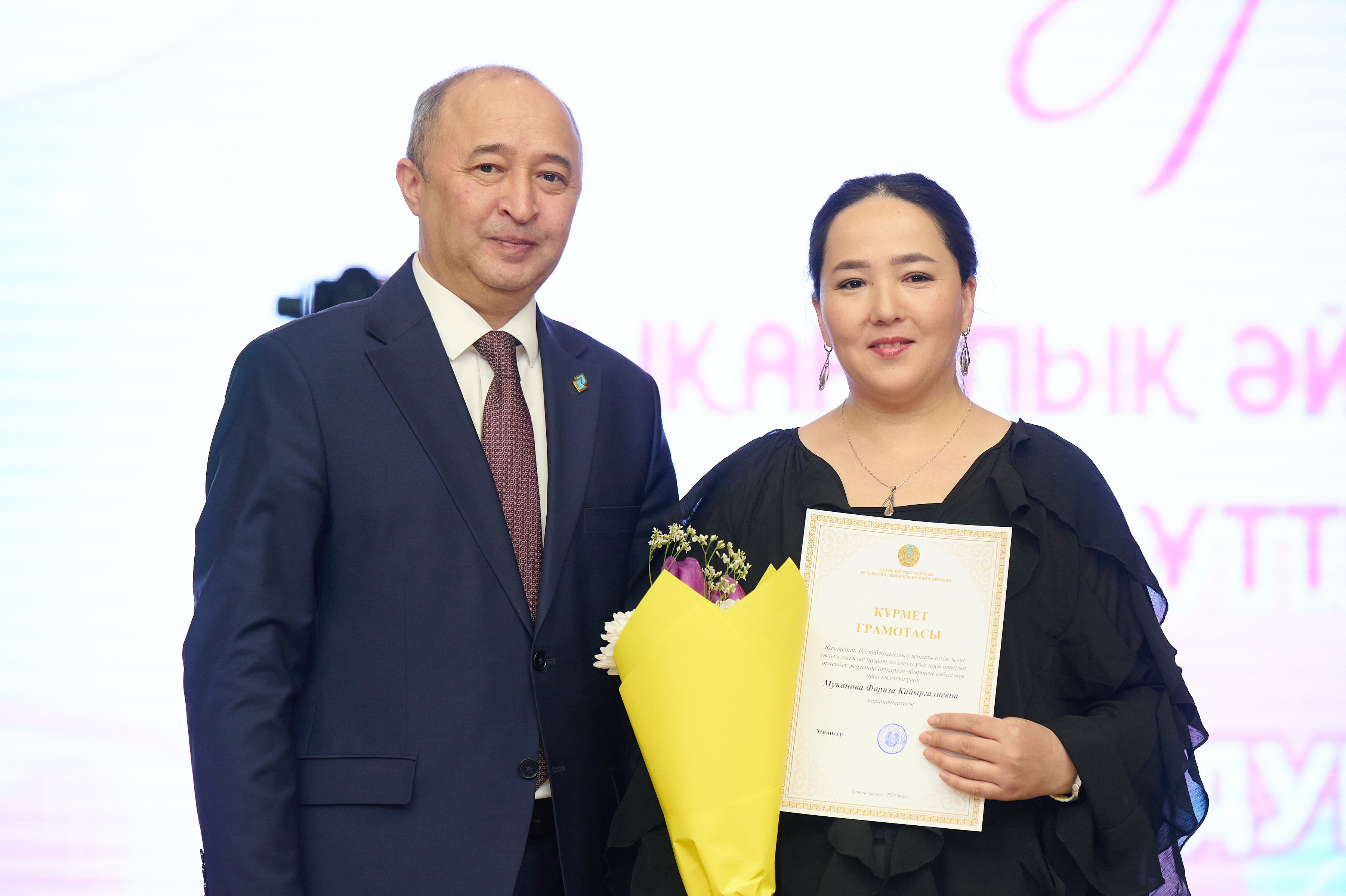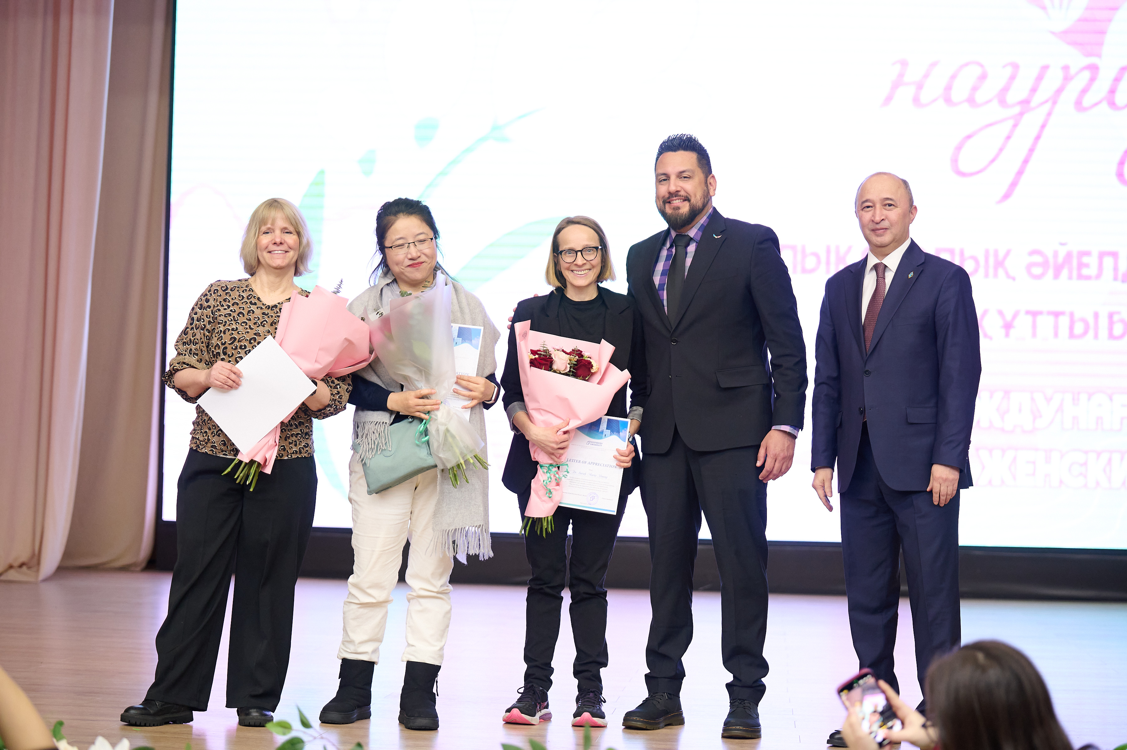 Дәстүрлі марапаттау рәсімінде: «Қазақ тілі мен әдебиет» кафедрасының профессоры Мендыкыз Есматова мен «Журналистика және әлеуметтік ғылымдар» кафедрасының аға оқытушысы Гуль-гуль Тулешеваға ҚР ҒЖБМ «Ана тілін дамытуға қосқан үлесі үшін» төсбелгісі табысталды. Сондай-ақ, 11 адам ҚР ҒЖБМ сертификаттары мен алғыс хаттарын алды. Оқытушылар, қызметкерлер және студенттерге Басқарма Төрағасы-Ректордың алғыс хаттары мен мақтау қағаздары табысталды. Қонақтарымыз бен серіктестерімізді–Аризона университетінің өкілдерін жылы шыраймен марапаттадық.