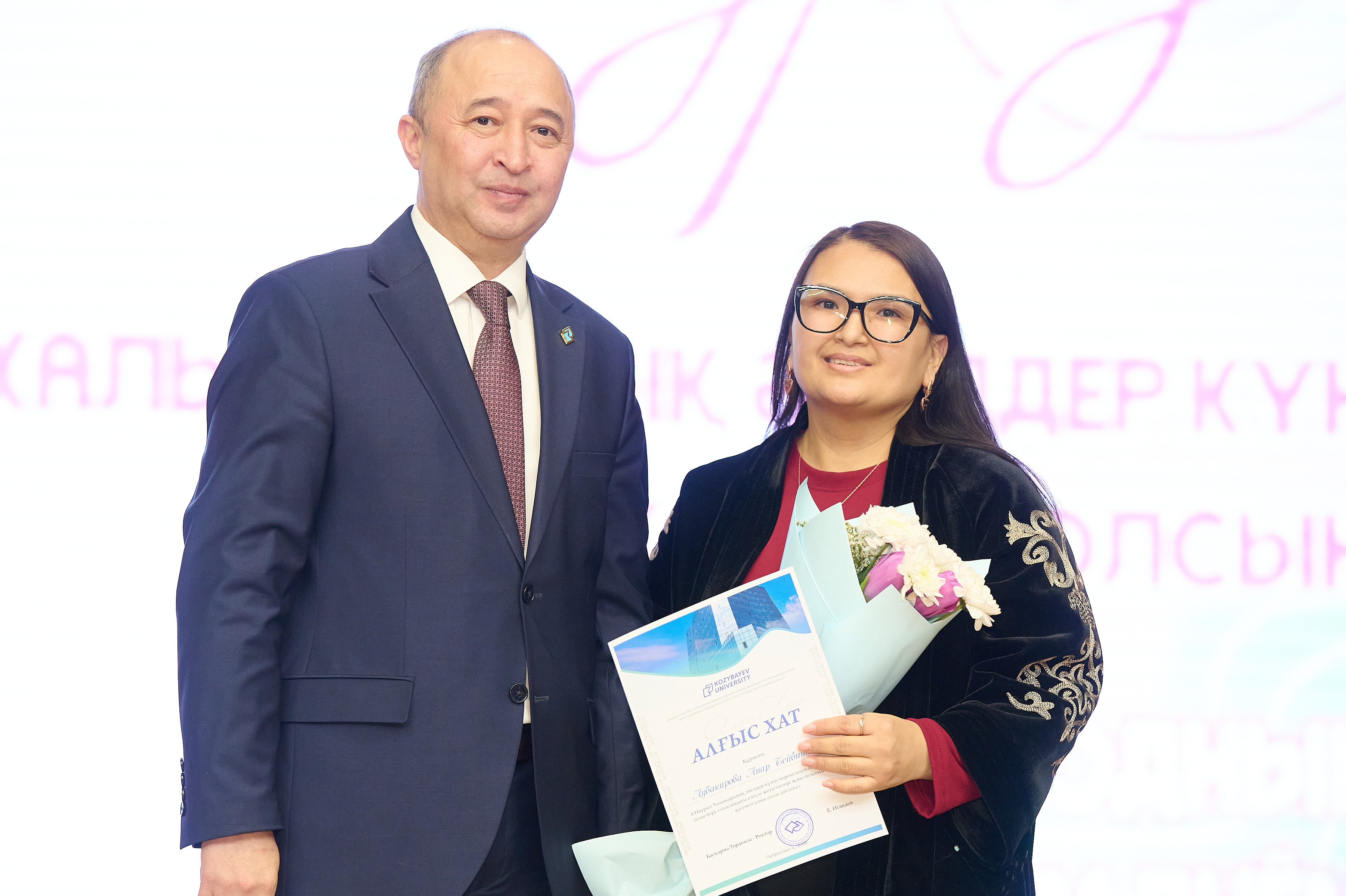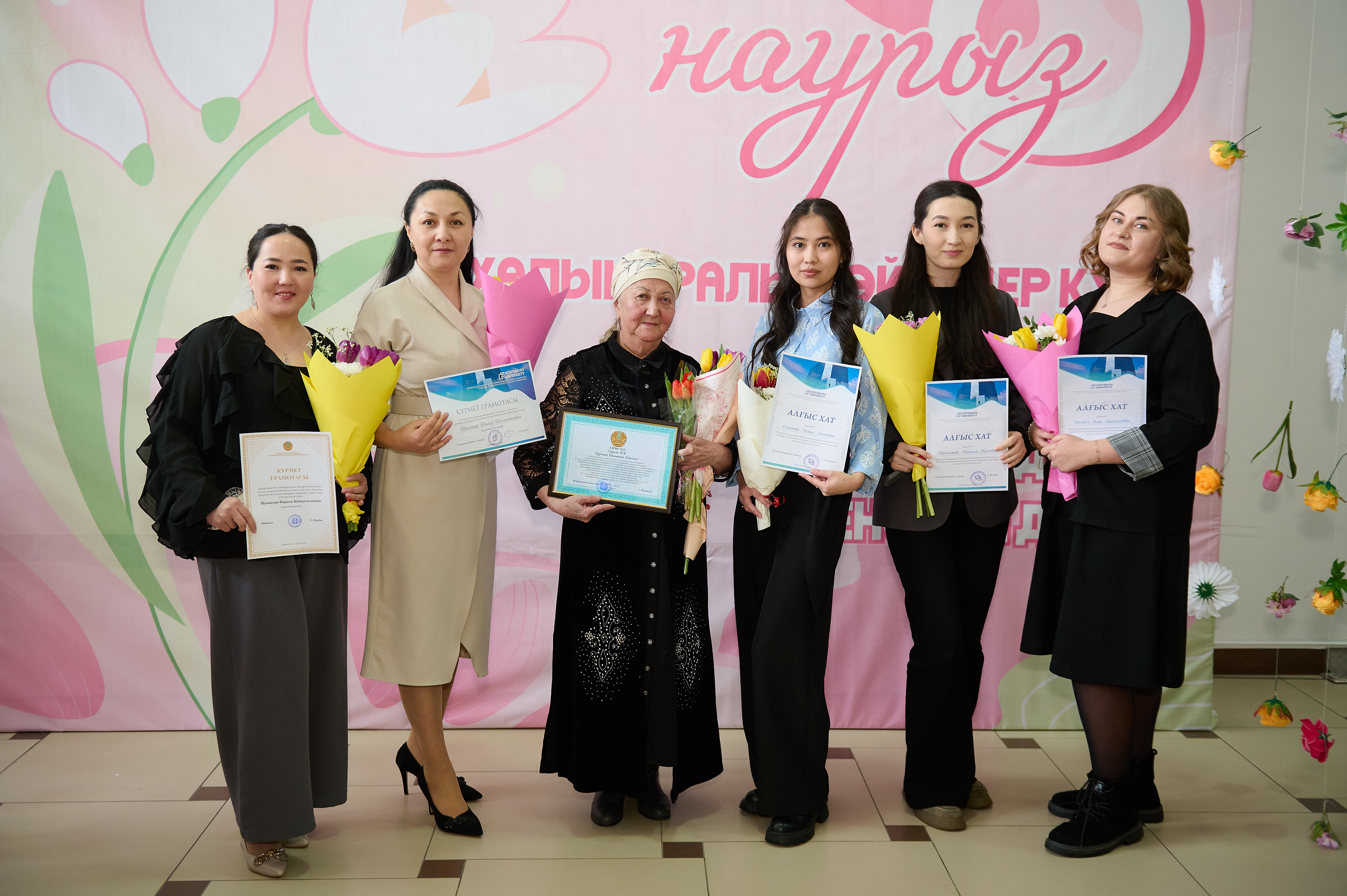 Университет ұжымы ардақты әйелдер қауымын 8 наурызбен құттықтады. Мерекелік кеш аясында белсенді студенттердің жүрекке жылу сыйлар әндері, ізгі лебіздері ұсынылды. Басқарма Төрағасы – Ректор Ербол Исақаев залда отырған аруларға ықылас гүлдерін табыстады. Сахна төрінде құттықтау сөз сөйлеп, университеттің дамуына елеулі үлес қосып жүрген әйелдер қауымының еңбегін ерекше атап өтті: «Сіздердің еңбектеріңіз, даналықтарыңыз бен қамқорлықтарыңыз әлемді жақсарта түседі. Құзыреттілік пен жауапкершілік қаситеттеріңіз студенттерді тыңдап, түсінуге және оларға қолдау көрсетуге мүмкіндік береді. Табандылықтарыңыз білім беру үдерісінің, ғылыми зерттеулер мен басқару шешімдерінің жоғары сапасын қамтамасыз етеді».