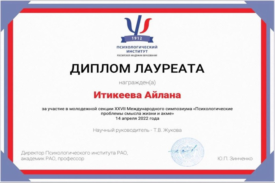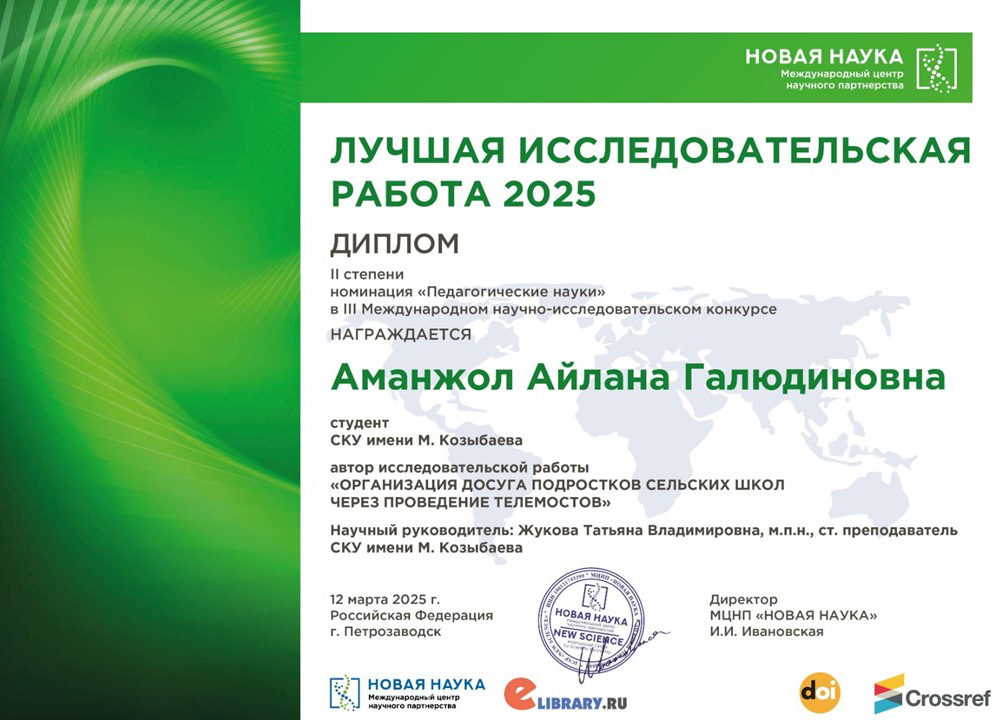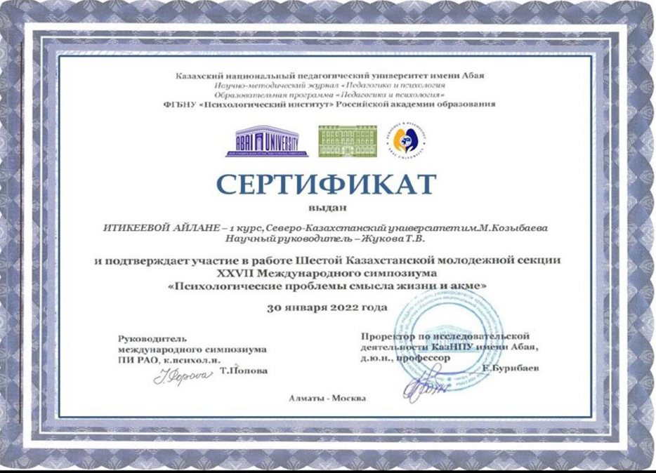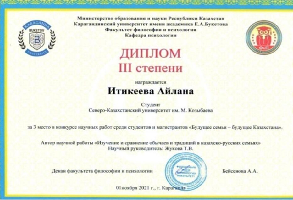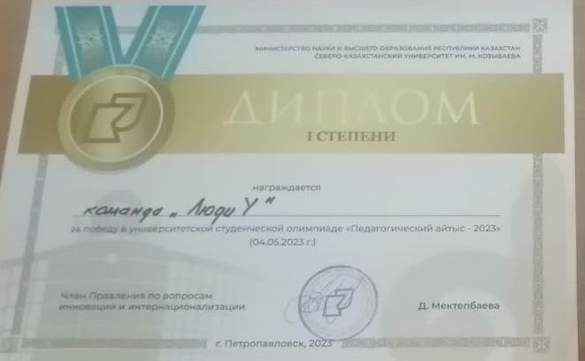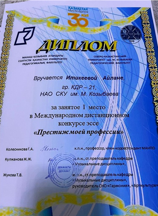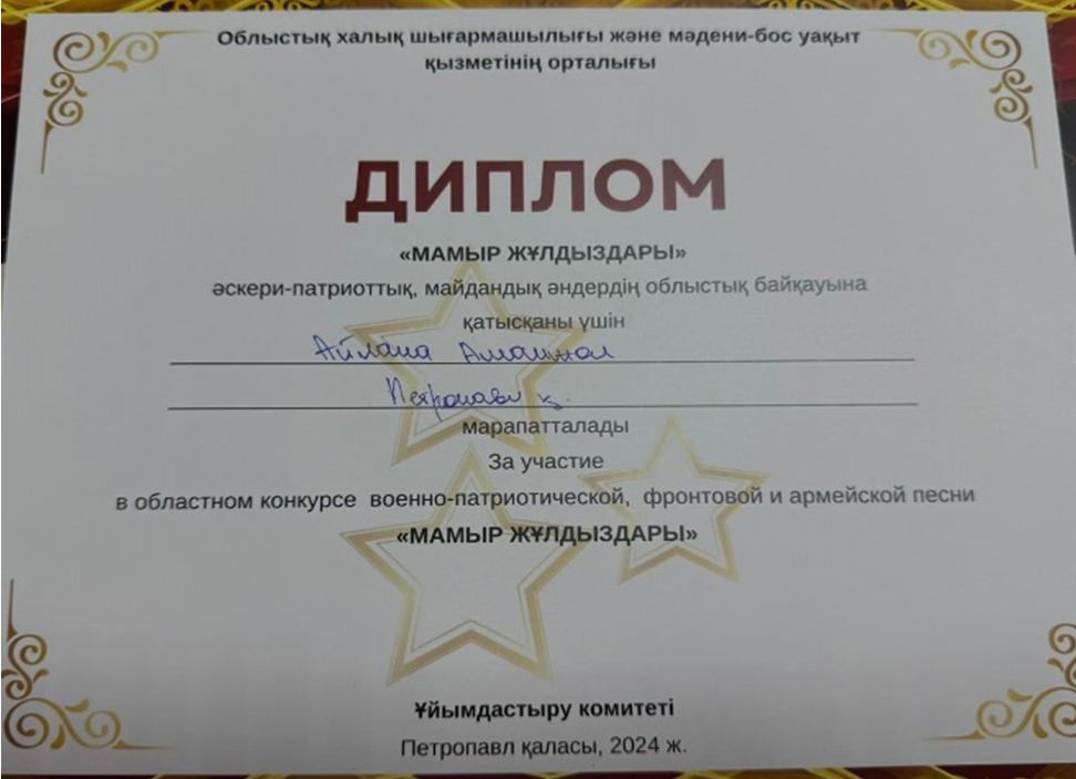 - Диплом от КГУ «Управления внутренней политики акимата СКО» за участие в летнем молодежном лагере, 2021 г.