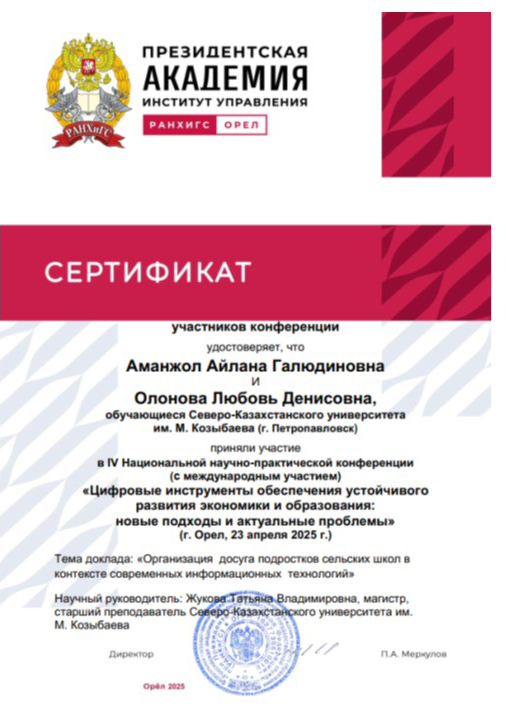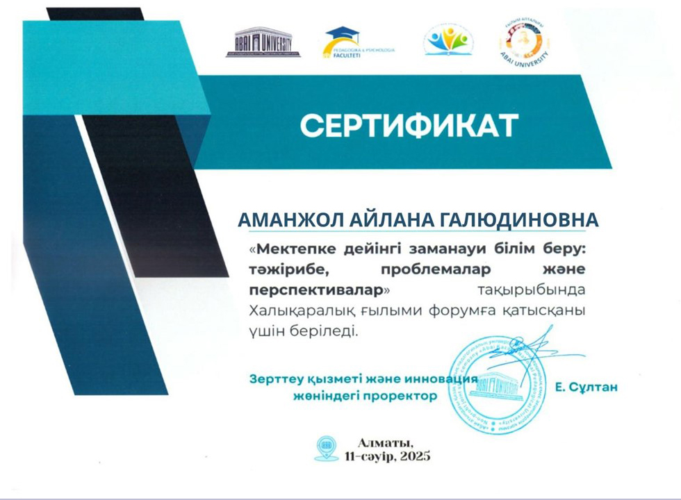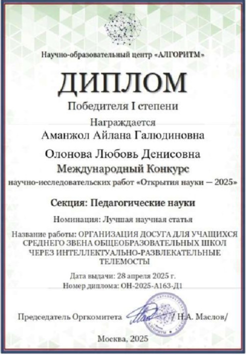 - Диплом за 2 место в республиканской предметной олимпиаде, 2025 г.