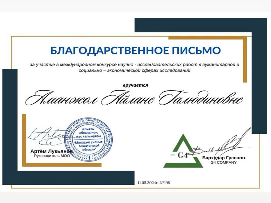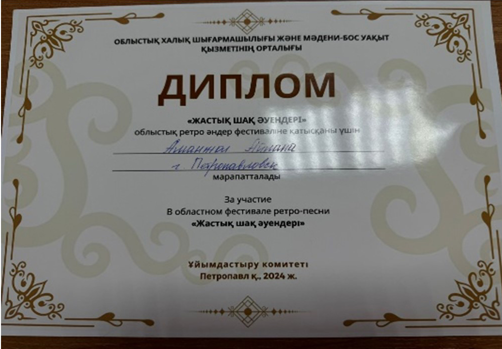 - Имеет благодарственные письма: «G4 COMPANY за участие в Международном конкурсе научно-исследовательских работ», Областного центра народного творчества и культурно-досуговой деятельности за участие в Областном фестивале ретро-песни «Жастық шақ әуендері» (г. Петропавловск, 2024 г.), Областного центра народного творчества и культурно-досуговой деятельности за участие в Областном конкурсе «Мамыр жұлдыздры» (г. Петропавловск, 2024 г.), Областного Управления культуры, развития языков и архивного дела за участие в Областном конкурсе профессионального мастерства работников культурно-досуговых учреждений «Моя профессия – мое духовное богатство» (г. Петропавловск, 2024 г.)